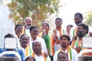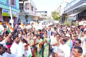 వేములవాడ పట్టణ మున్సిపల్ ఎన్నికల వేళ 11వ వార్డు కాంగ్రెస్ పార్టీ అభ్యర్థి సరిపెల్లి అర్చన వార్డులో విస్తృత ప్రచారం నిర్వహించారు. భారతీయ సంప్రదాయానికి ప్రతీకగా వార్డులోని మహిళా ఓటర్లకు కుంకుమ దిద్ది, వారికి నమస్కరిస్తూ మద్దతు కోరడం స్థానికంగా అందరినీ ఆకట్టుకుంది. ప్రతి ఇంటి గడప తొక్కిన అర్చన అక్కా చెల్లెళ్లను ఆత్మీయంగా పలకరిస్తూ వారి కష్టసుఖాలను అడిగి తెలుసు కున్నారు. తాను గెలిచిన వెంటనే వార్డులో నెలకొన్న సమస్యలను పరిష్కరిస్తానని, ముఖ్యంగా మహిళా సంక్షేమానికి పెద్దపీట వేస్తానని ఆమె హామీ ఇచ్చారు. కాంగ్రెస్ పార్టీ ప్రవేశపెట్టిన సంక్షేమ పథకాలను ప్రజలకు వివరిస్తూ, అభివృద్ధికి చేయూతనివ్వాలని విజ్ఞప్తి చేశారు. అభ్యర్థి అర్చన కు వార్డు మహిళల నుంచి బ్రహ్మరథం పట్టి, హారతులు ఇచ్చి ఘన స్వాగతం పలికారు. ఈ కార్యక్రమంలో కాంగ్రెస్ పార్టీ ముఖ్య నేతలు, కార్యకర్తలు వార్డు ప్రజలు భారీ సంఖ్యలో పాల్గొన్నారు.